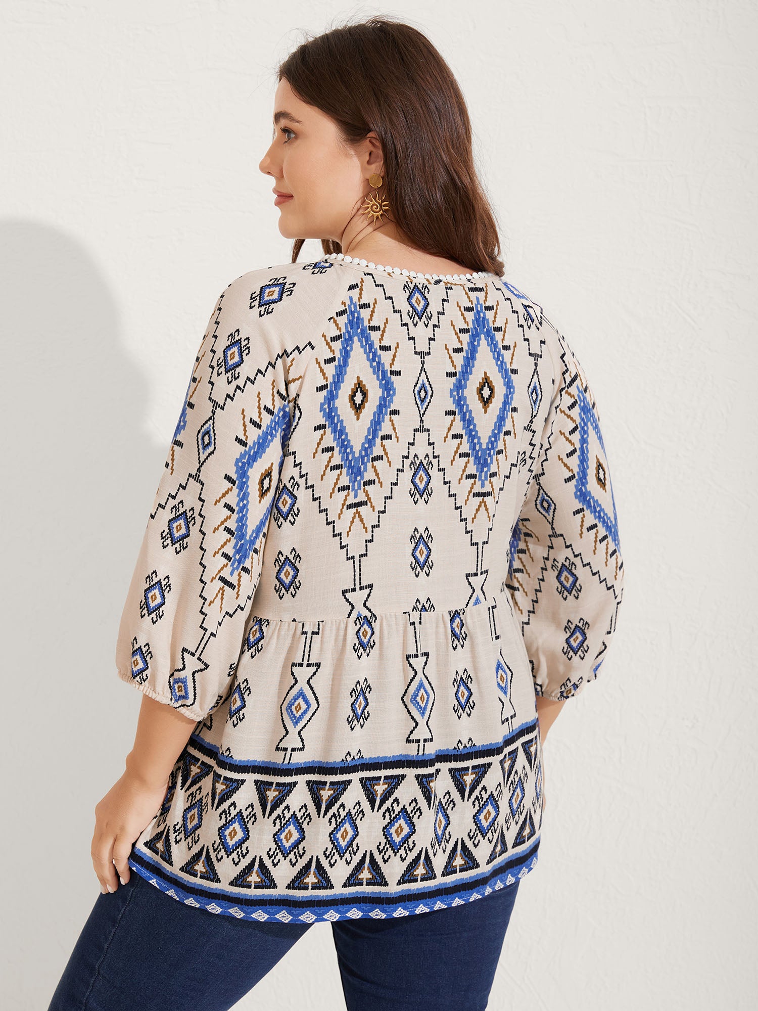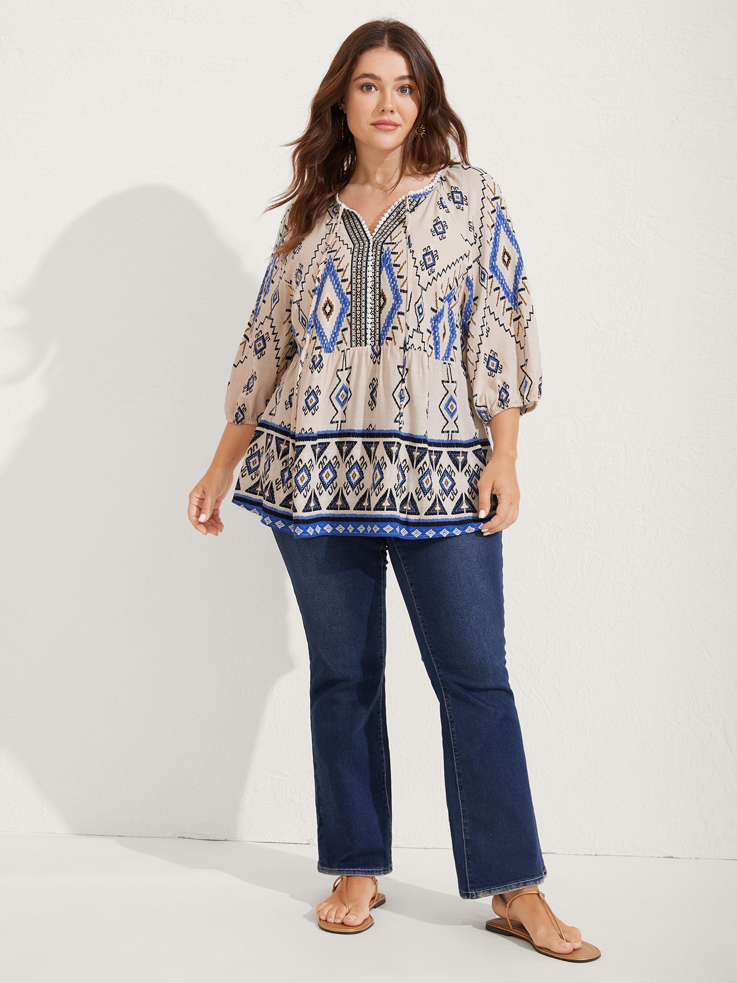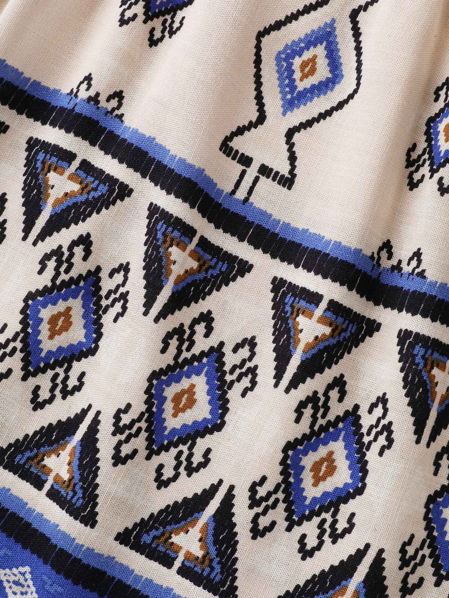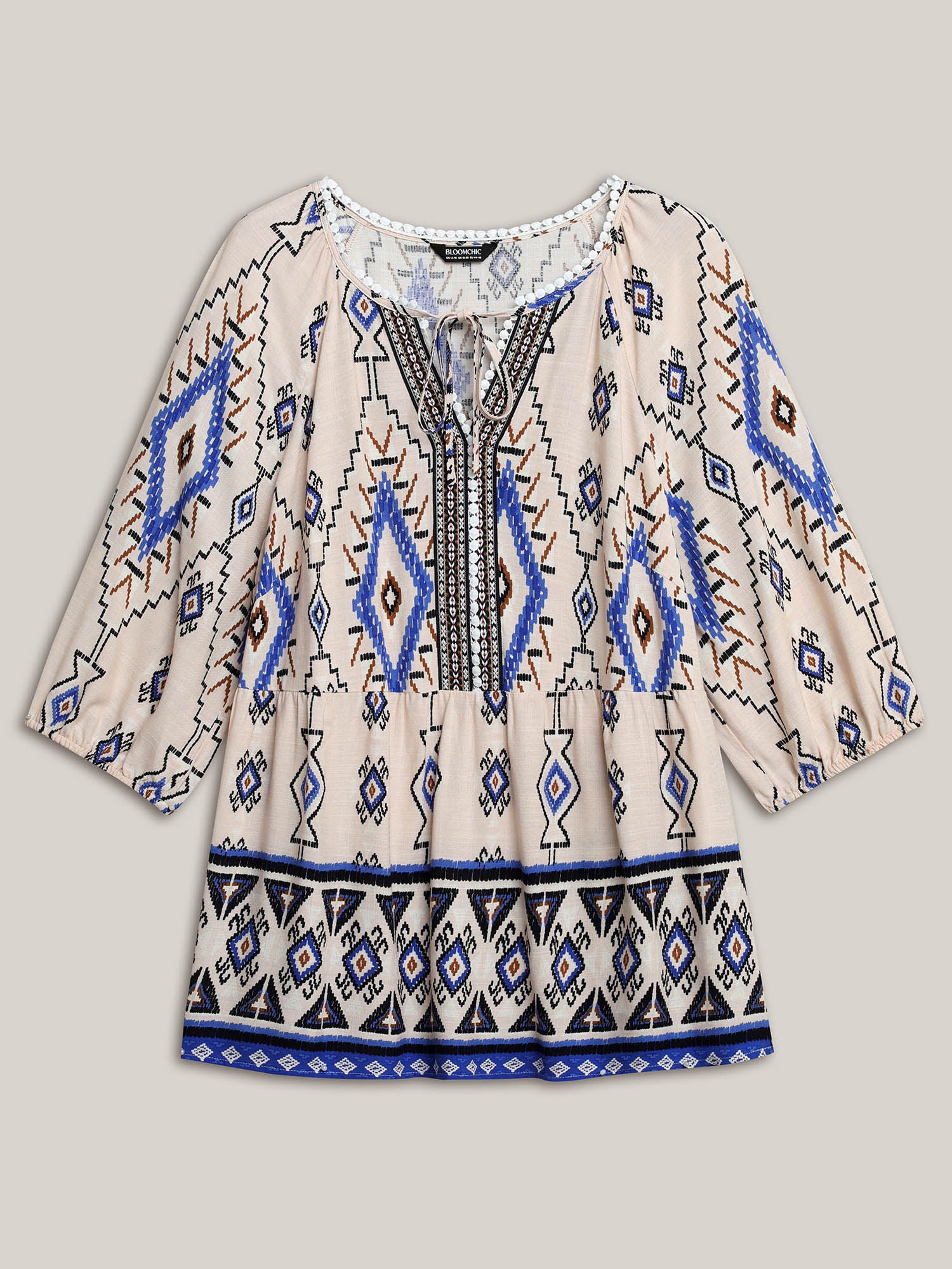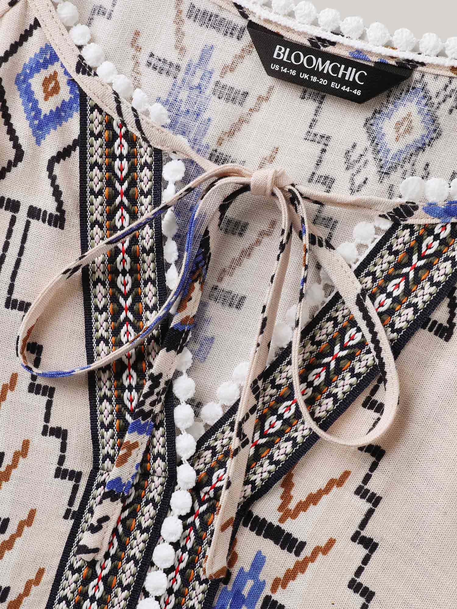 Boho Print Lace Detail Neck Tie Blouse