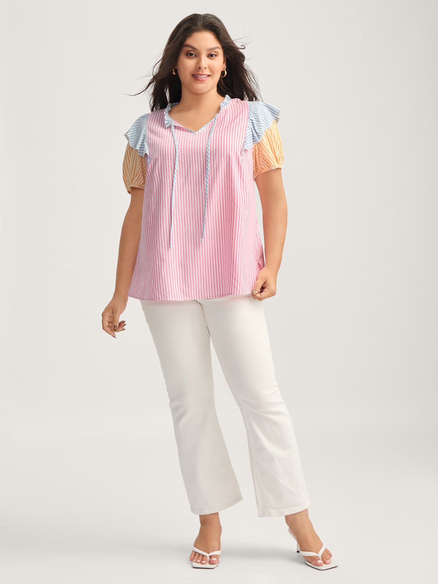 Cotton Colorful Stripes Ruffled Neck Tie Blouse