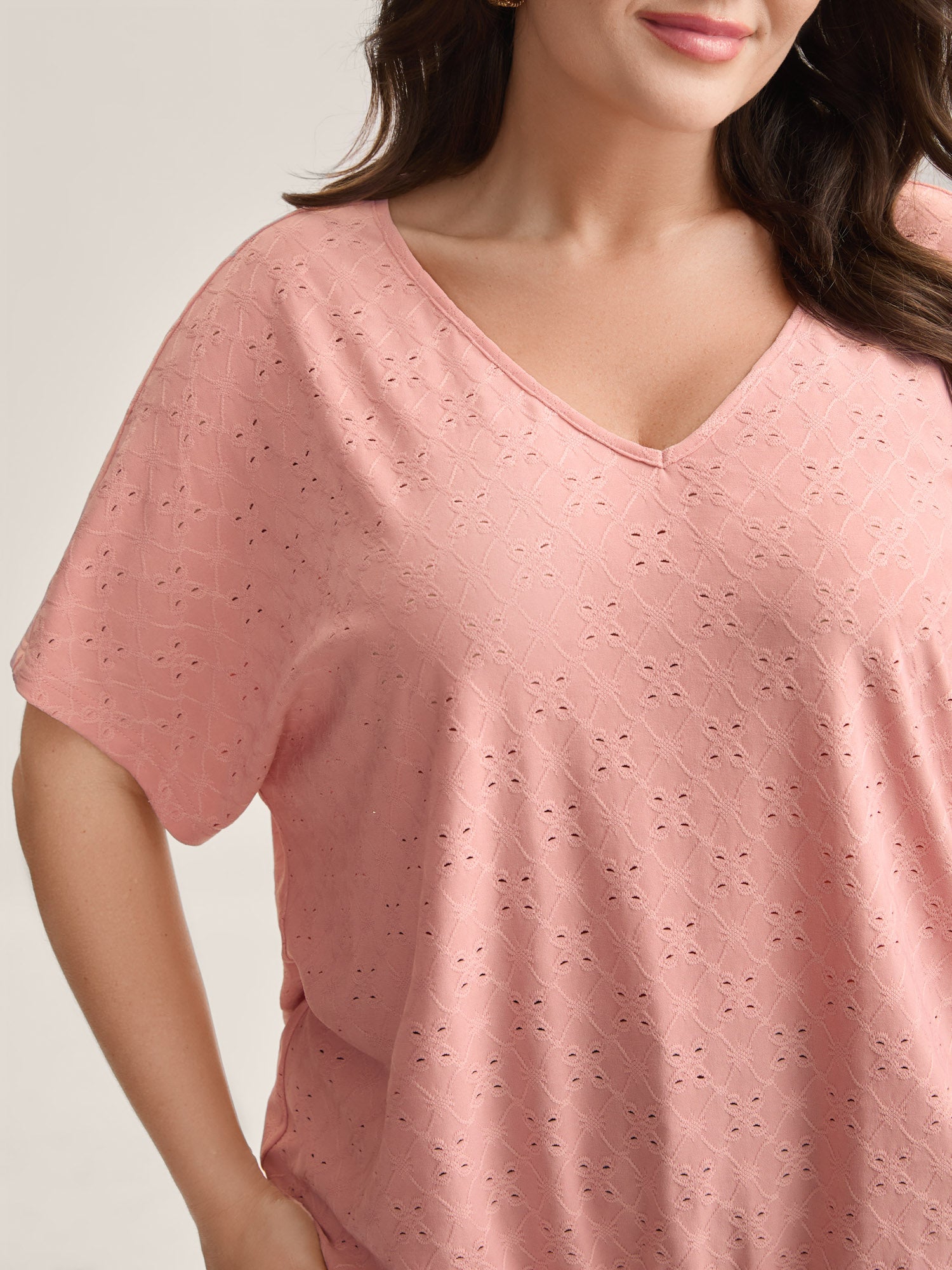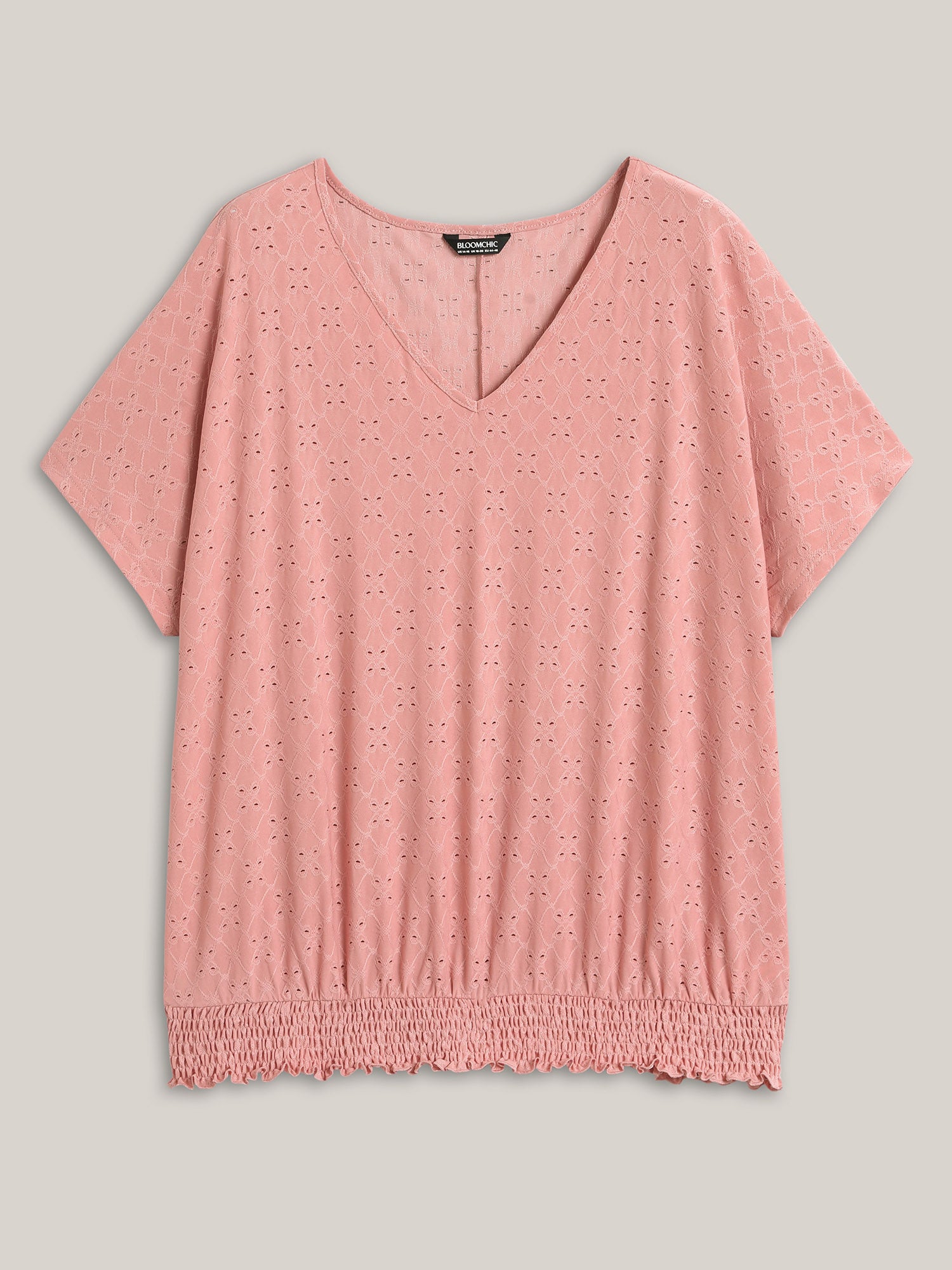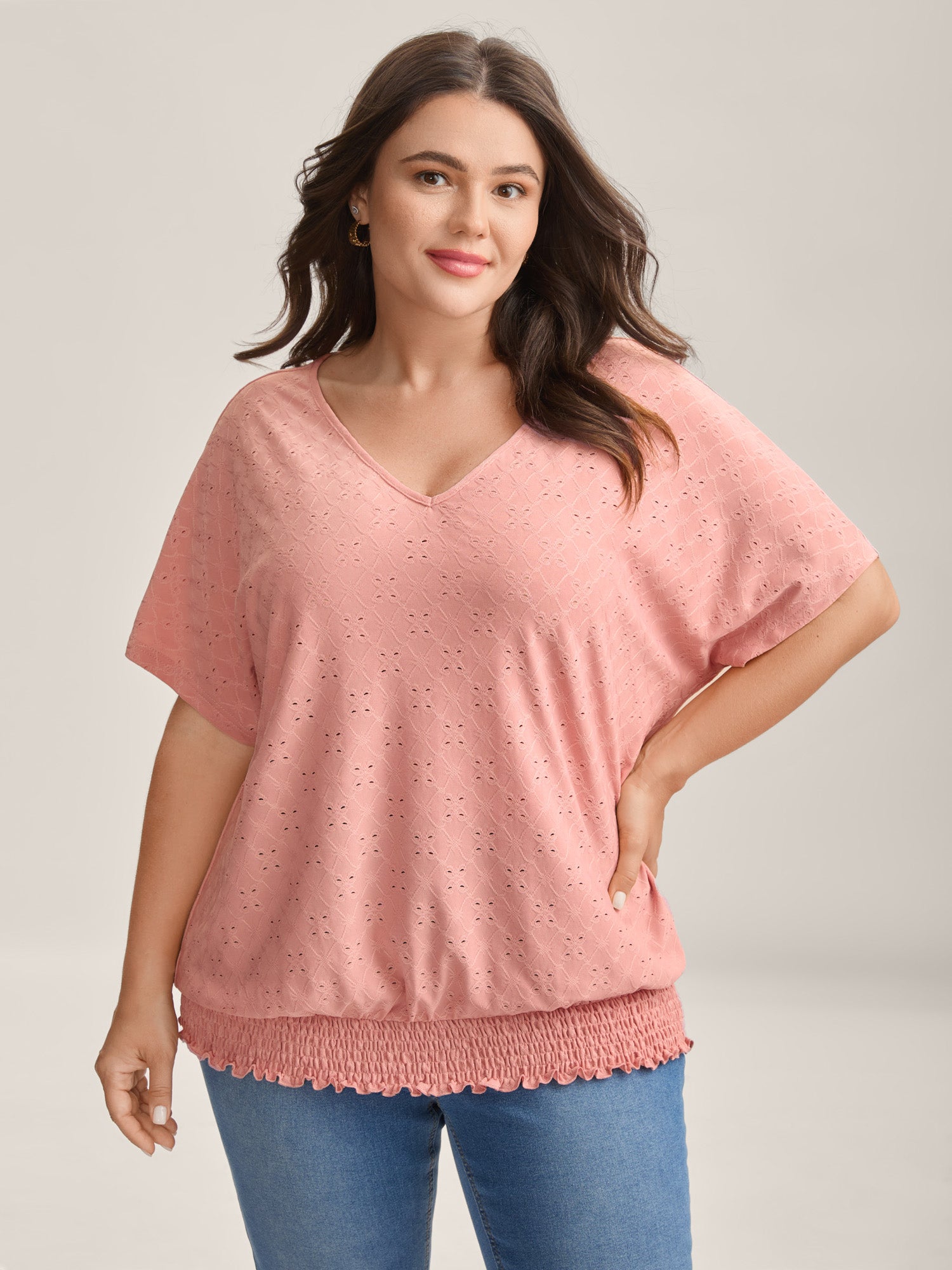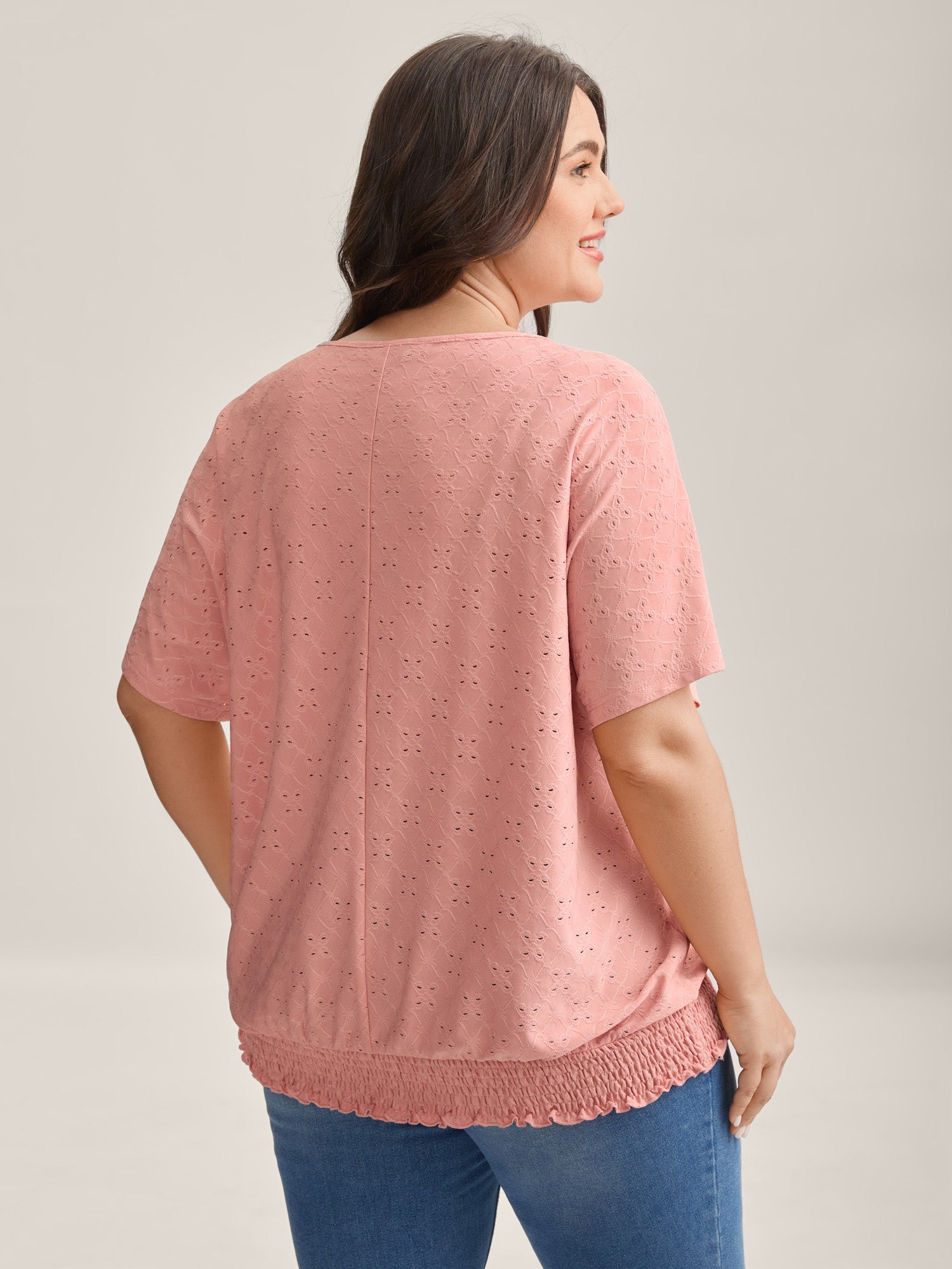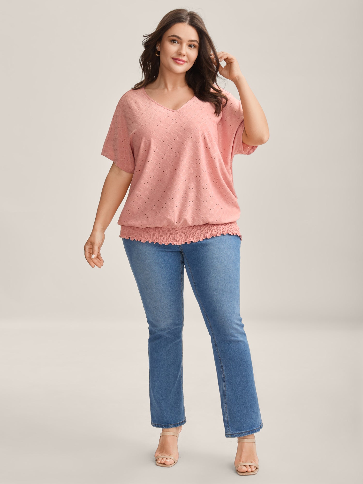 Eyelet Trim Flared Sleeve Shirred Hem Top