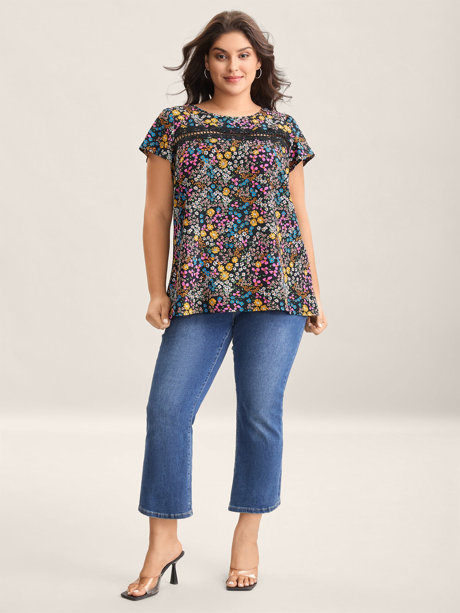 Multi-Color Floral Print Lace Spliced Blouse