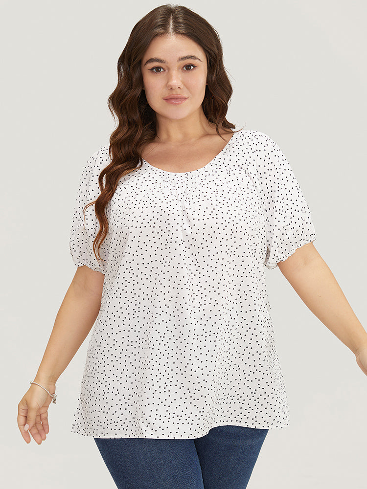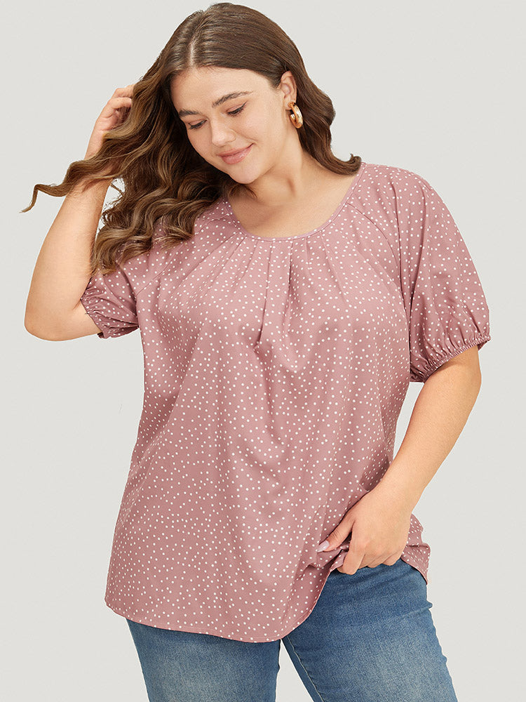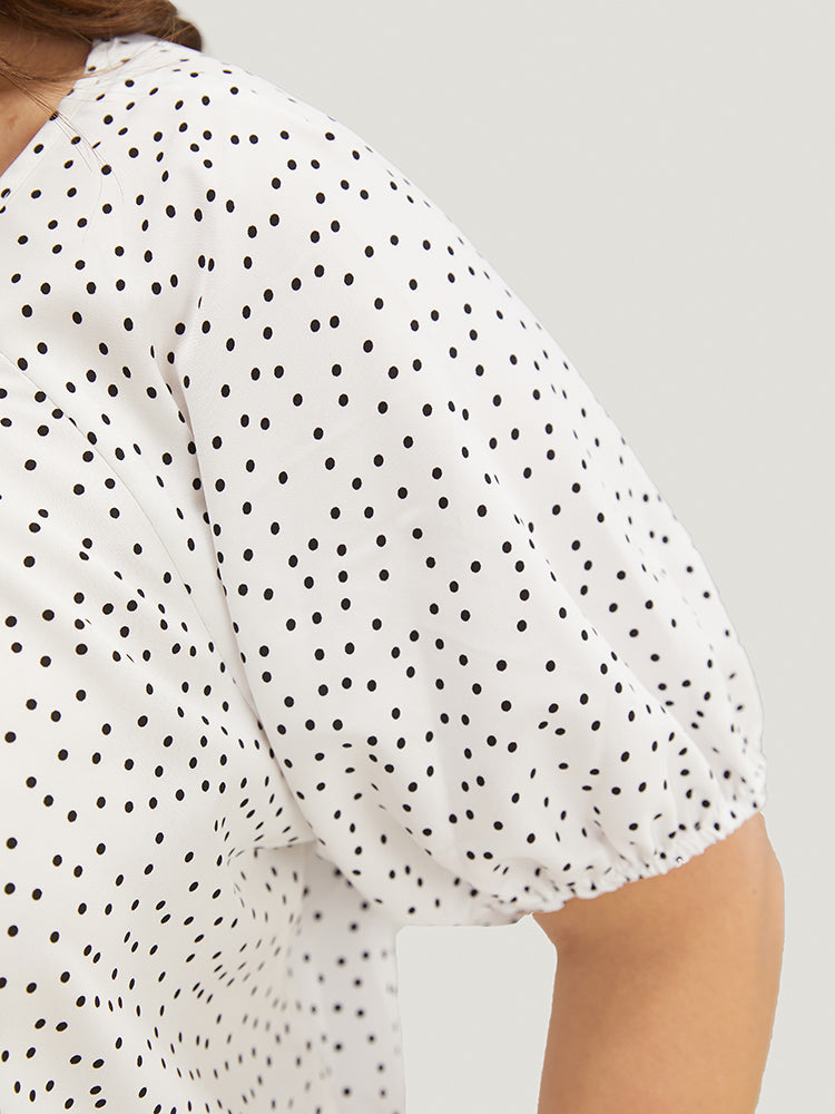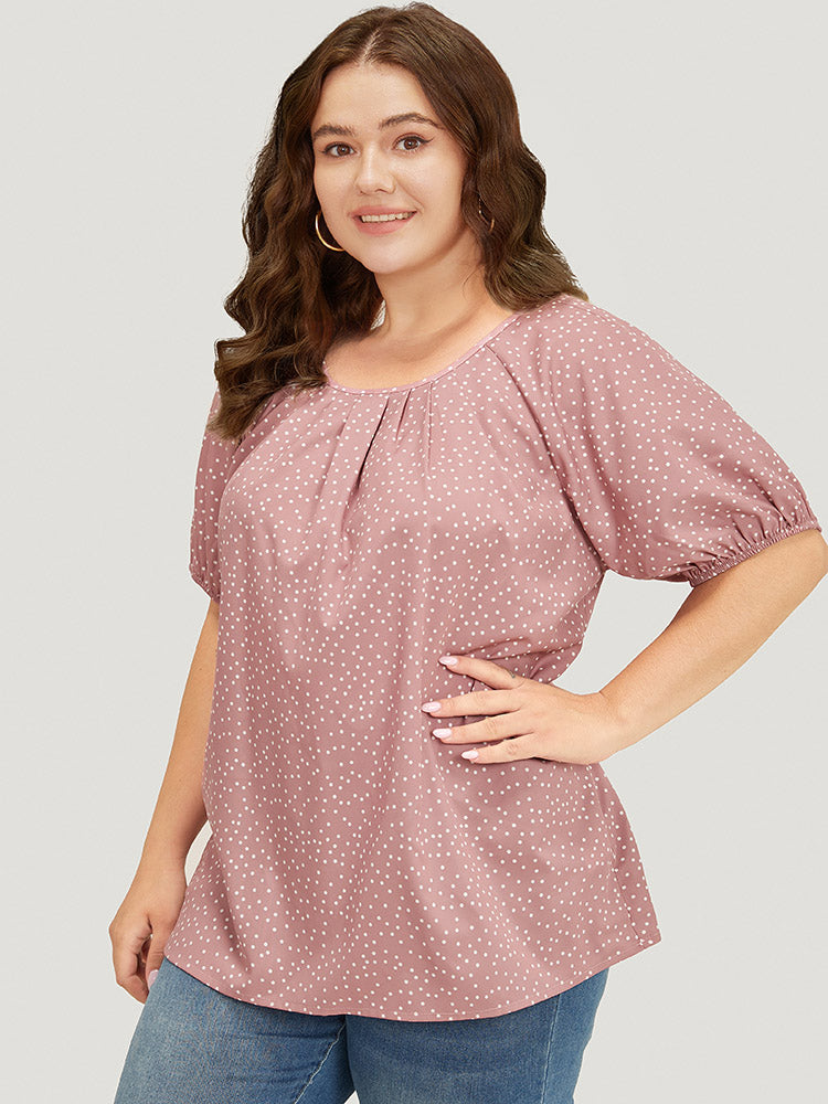 Polka Dot Pleated Round Neck Puff Sleeve Blouse