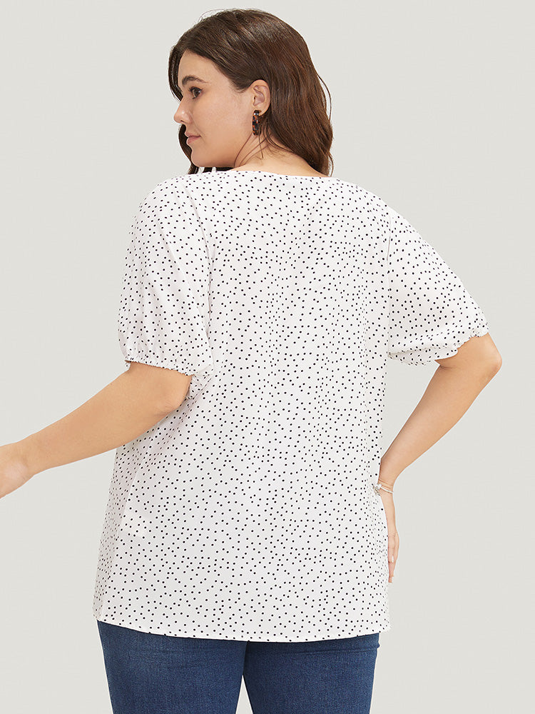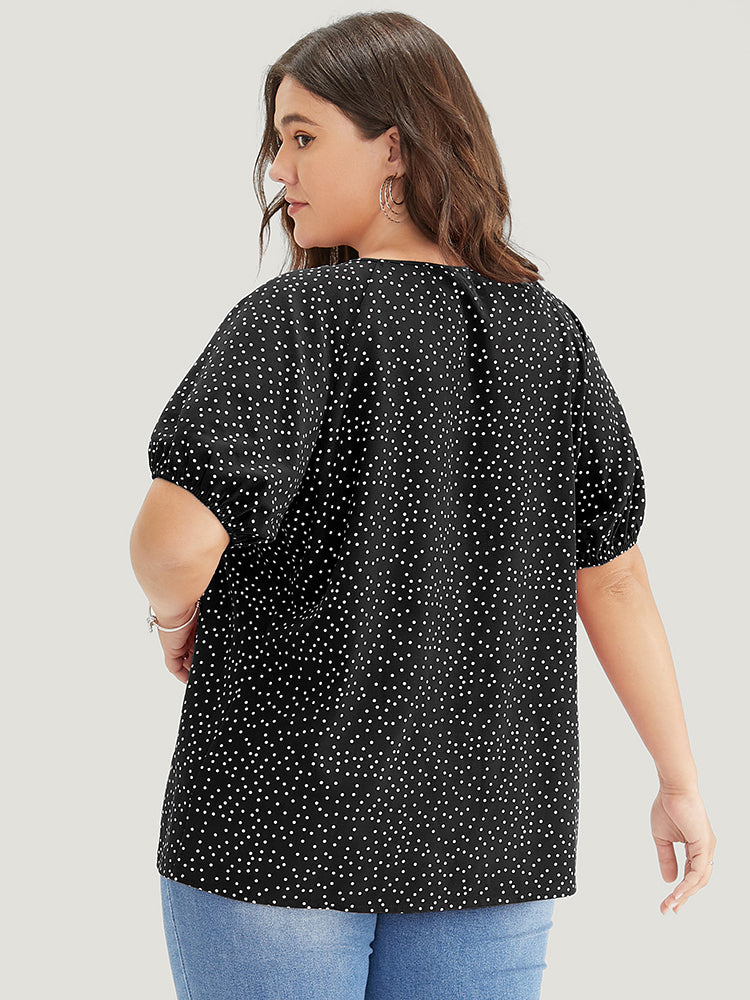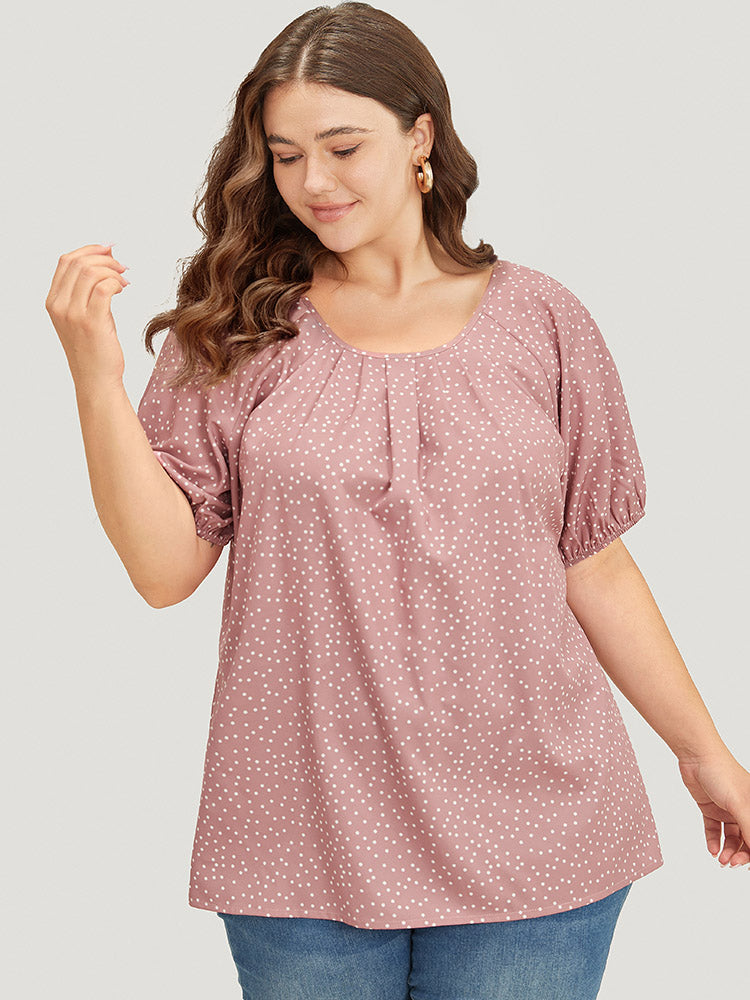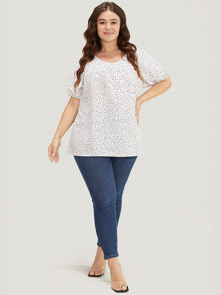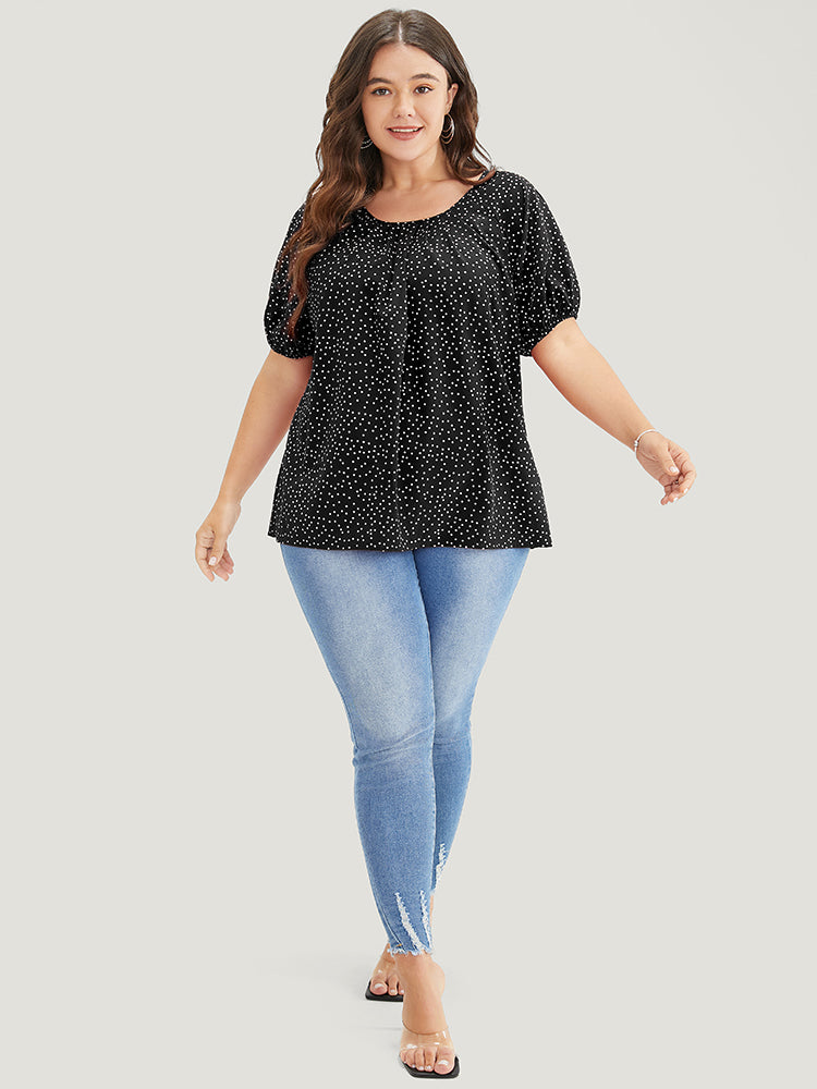 Polka Dot Pleated Round Neck Puff Sleeve Blouse