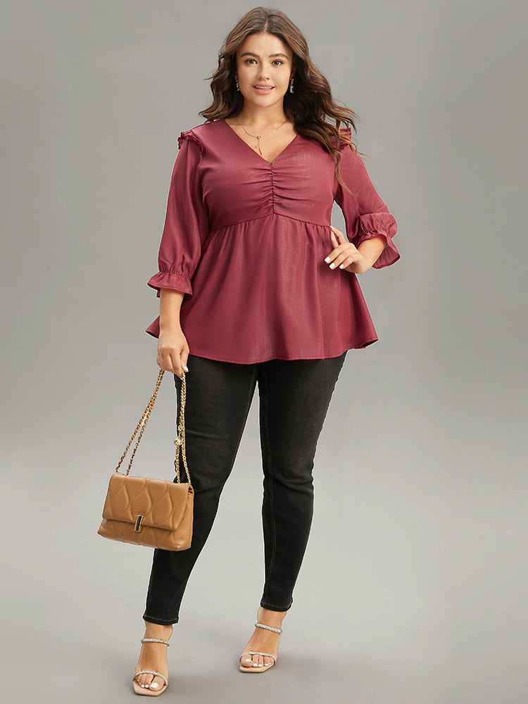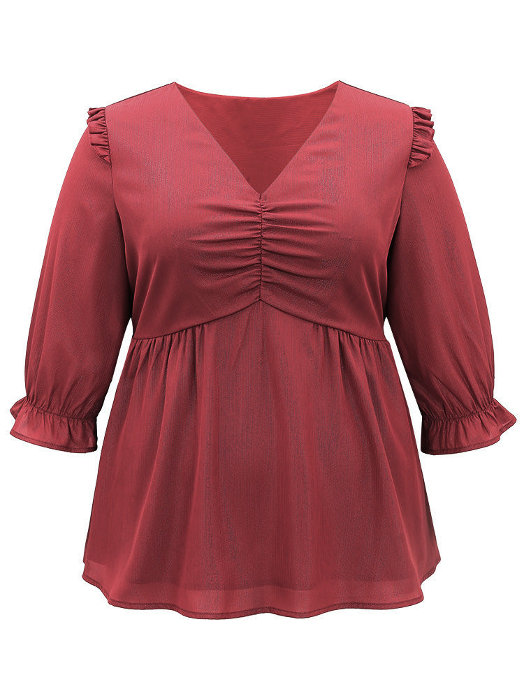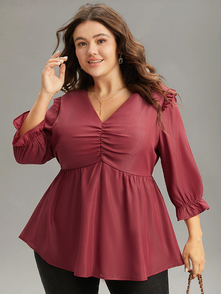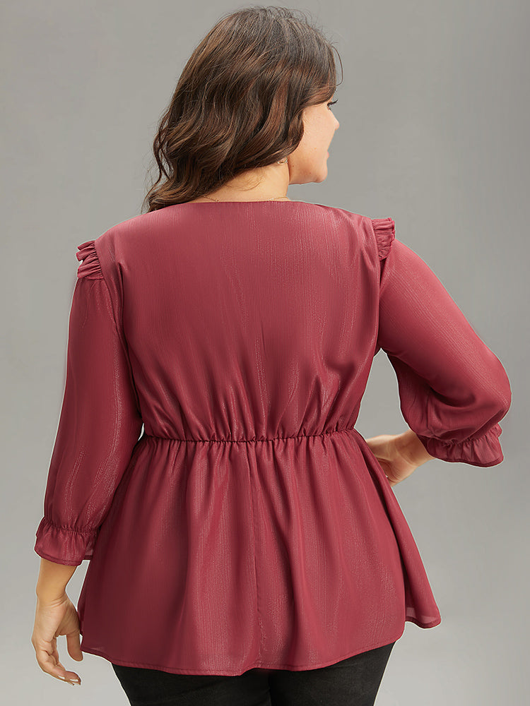 Solid Frill Trim Ruched Elastic Waist Blouse
