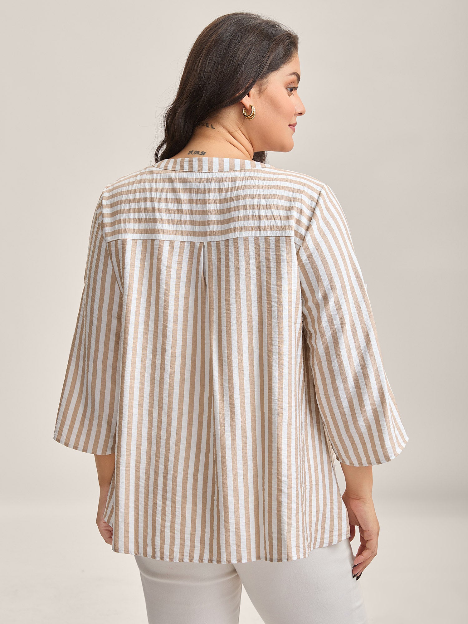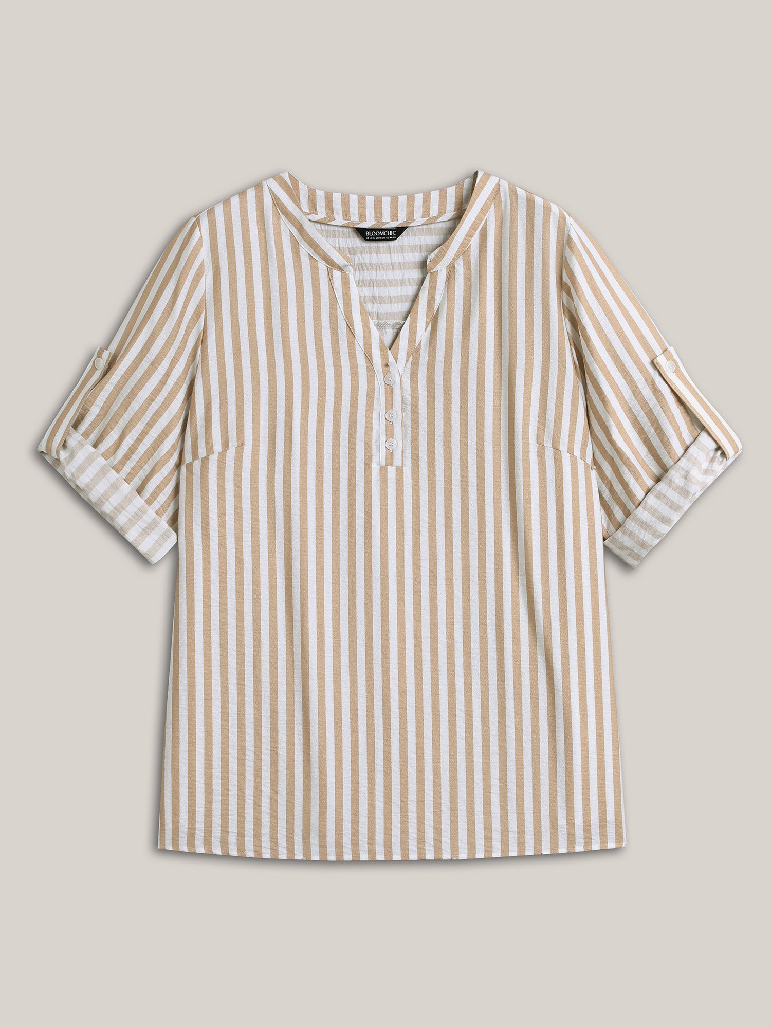 Stripe Print Tab Sleeve Notched Collar Blouse