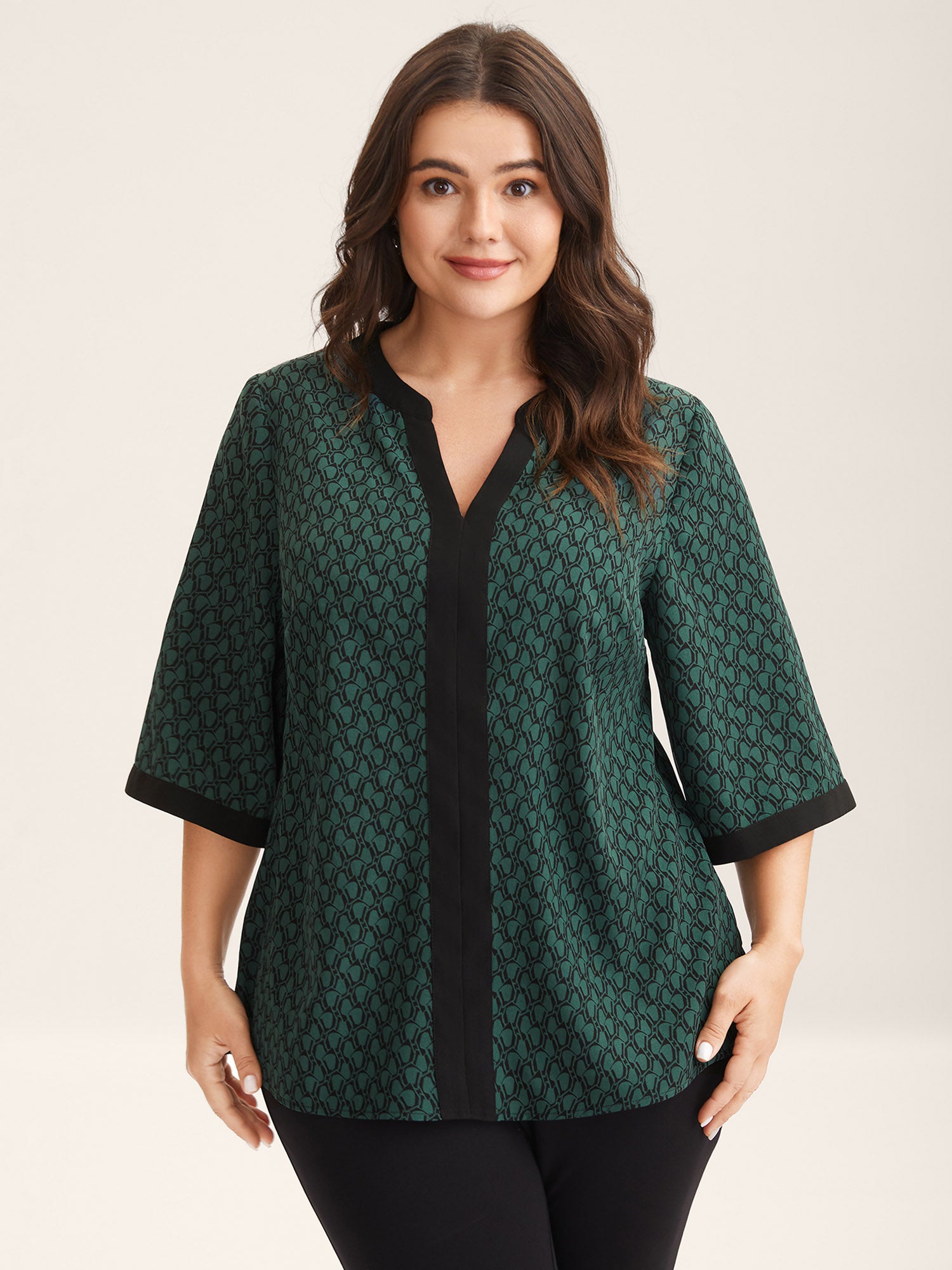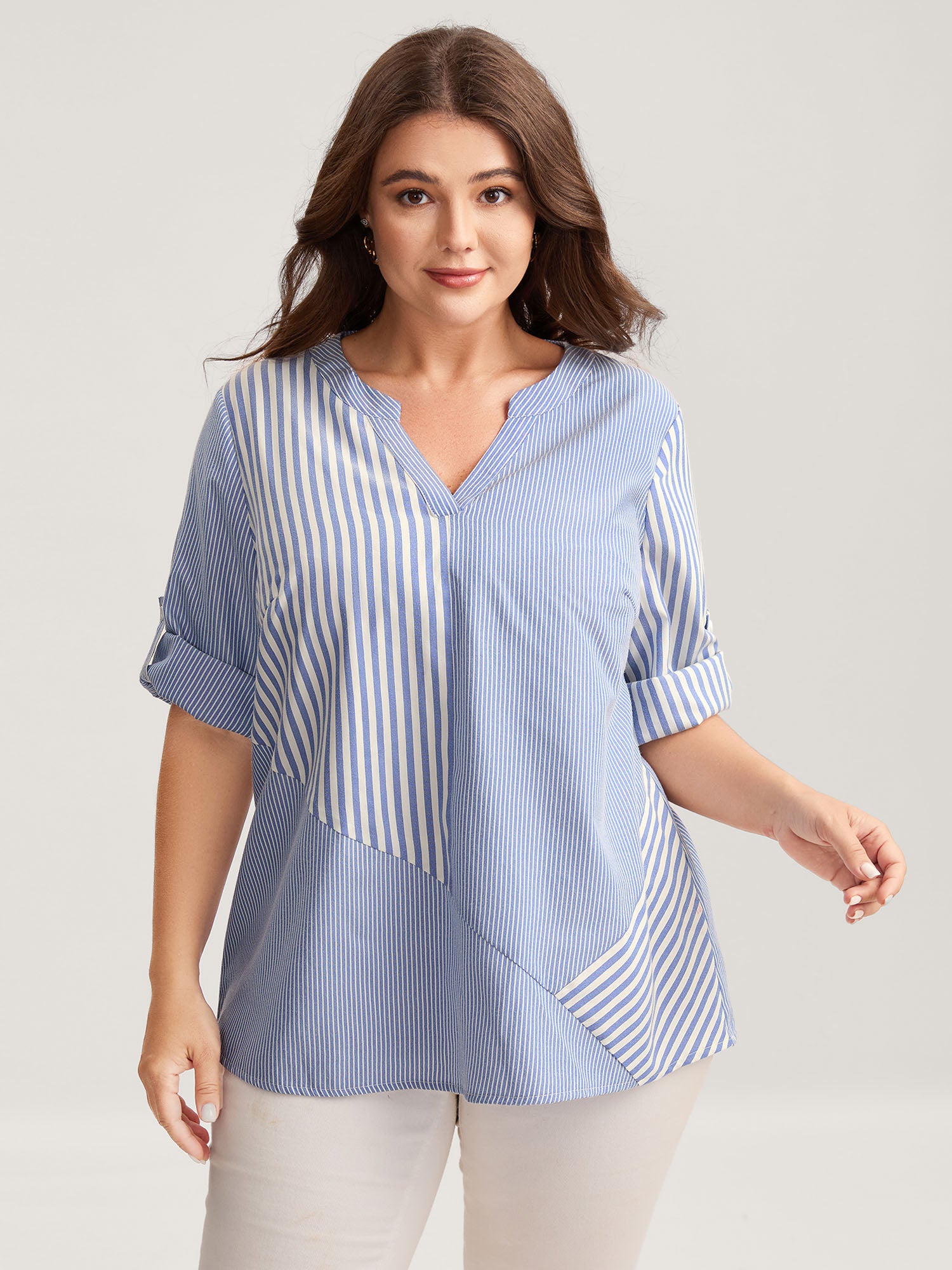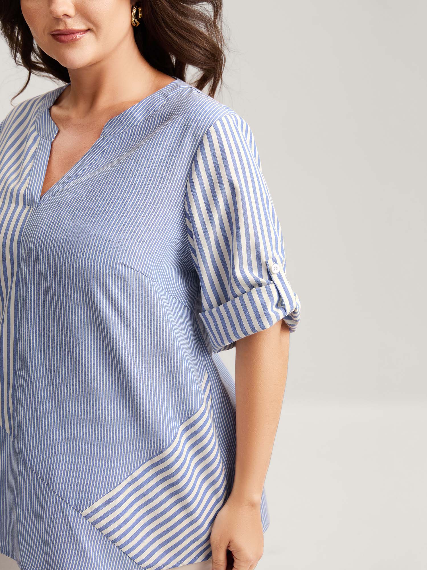 Stripe Print Tab Sleeve Notched Collar Blouse