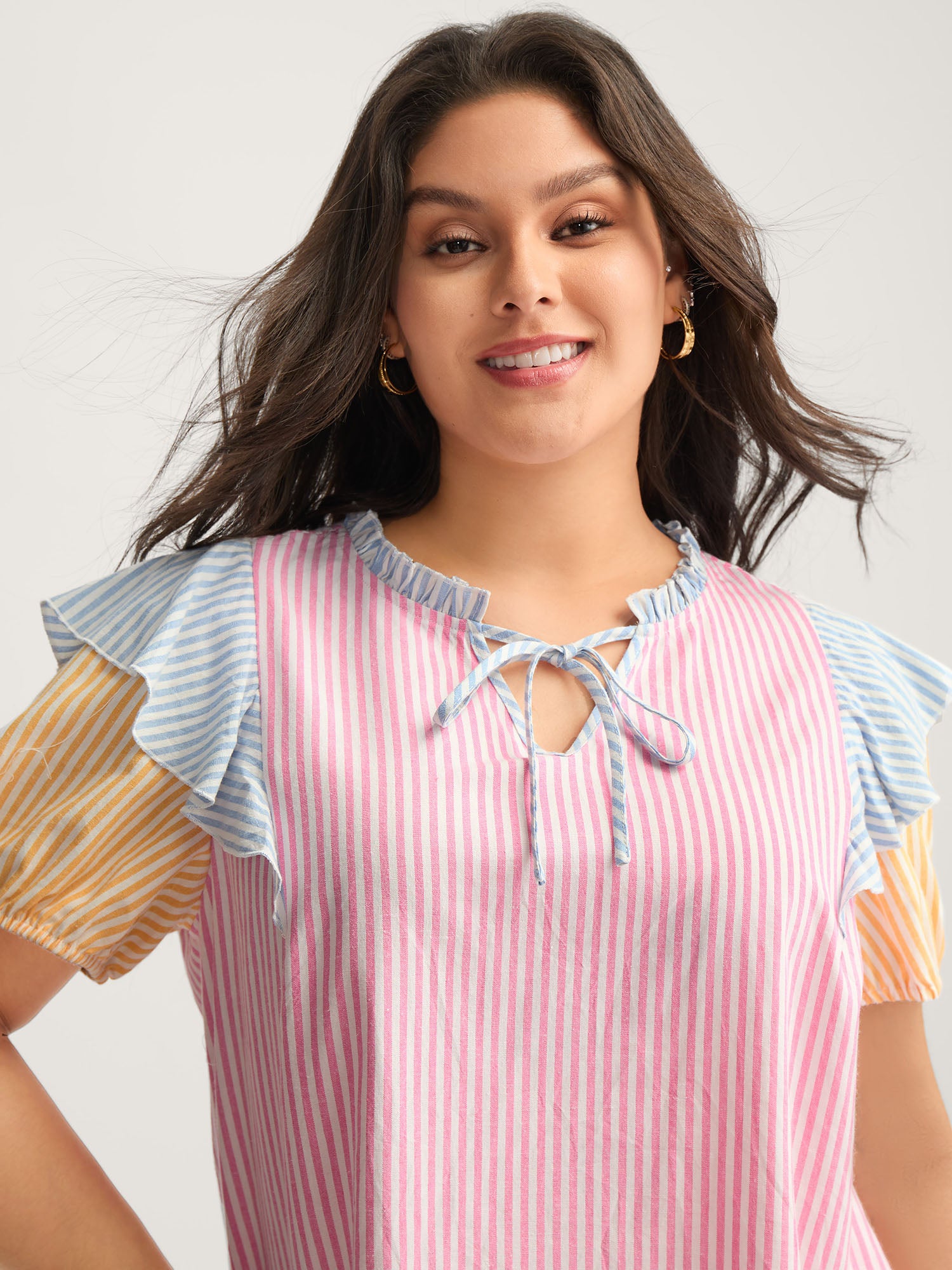 Cotton Colorful Stripes Ruffled Neck Tie Blouse
